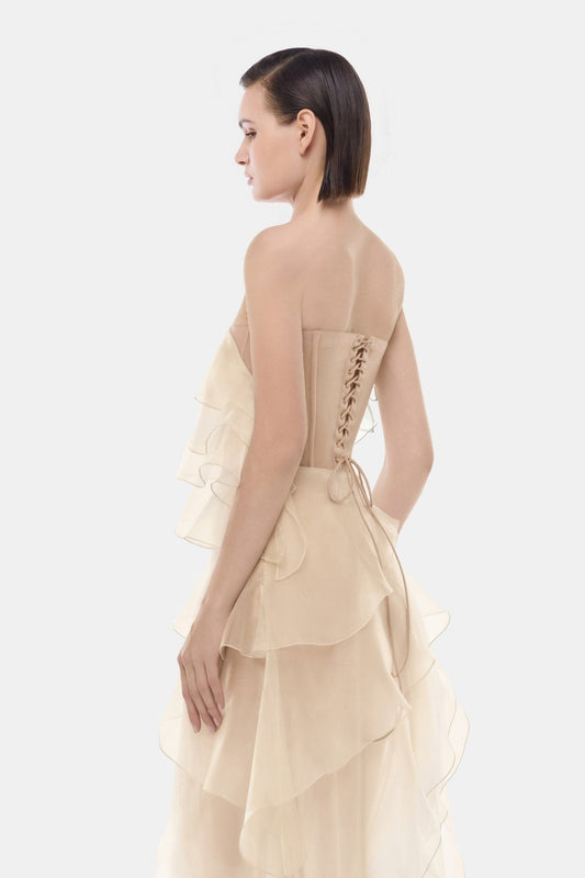 Beige Strapless Ruffle Maxi Dress