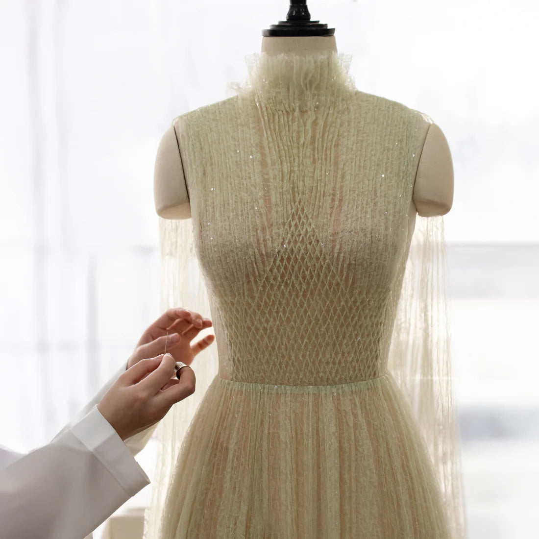 The lace is first finely pleated to create rhythmic depth, then carefully smocked by hand to form soft, elastic gathers that adapt to the body. Concentrated at the underbust and hips, this technique gently shapes the silhouette while allowing the fabric to fall naturally.